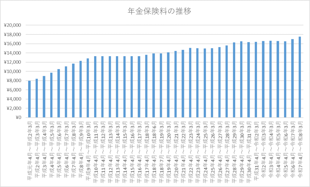 年金保険料の変遷はグラフのとおり、増加傾向です。