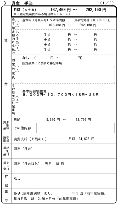 これは、実際の求人の賃金・手当欄です。